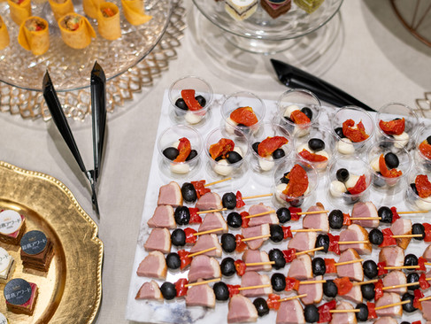 高低差のあるレイアウト、光を拾ってきらめくガラス皿、彩り豊かなフィンガーフード。ホワイト×ゴールドを基調にした高級感のあるコーディネートが、普段は無機質であろう会議室全体の雰囲気を一段引き上げ、まさに“アワード感”のある華やかさを演出していました。